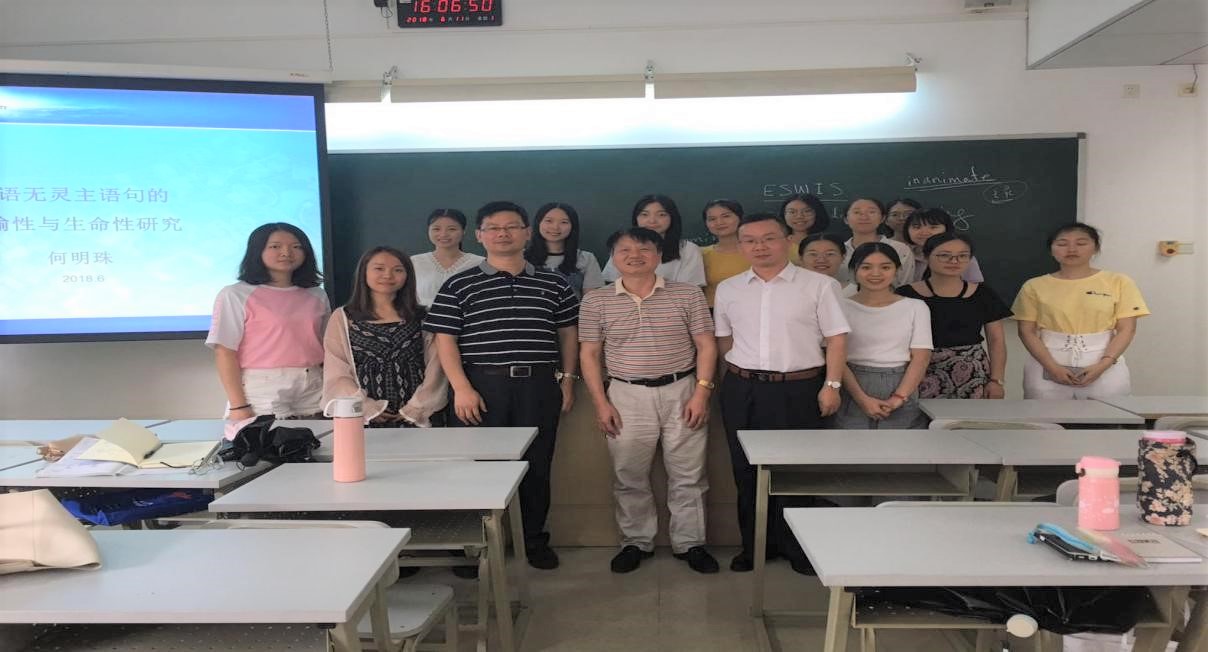 讲座伊始,肖坤学院长向在座师生简要介绍了何明珠教授的学术背景。接着,何明珠教授从主题为“英语无灵主语句的隐喻性与生命性研究”出发,从隐喻性和生命性视角探讨并解释了英语无灵主语句的运用。何明珠教授从他对英语无灵主语句的研究过程中的其中两篇论文为例,向我们详细介绍了英语无灵主语句。何教授的第一篇论文试图根据认知语言学的概念跨域映射原理,探索英语无灵主语句的隐喻性根源;并在认知隐喻的经验基础上,探索英语无灵主语句的生命性始源,解释英语无灵主语句的普遍性和生动性原因。何教授通过生动的例子向我们解释了手脚动作、视觉行为、听觉行为、言语行为、心理行为等方面的动词都能构成英语无灵主语句。