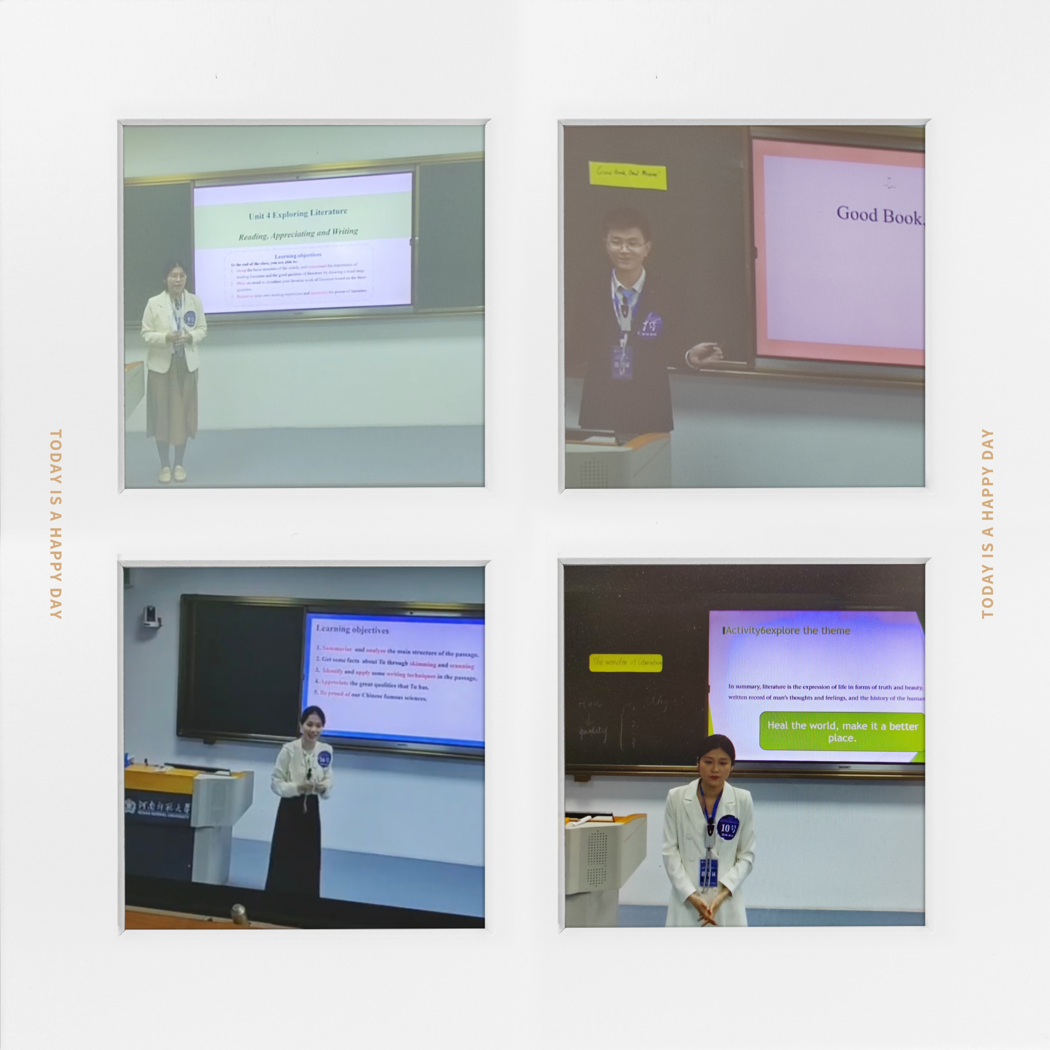 此次参赛选手共230名,因选手人数较多,1天的赛程显得十分紧张。第一场比赛于21日早晨8点举行,要求选手6点要检录,这意味着第一场参赛选手需4点起床,5点吃早餐,5:40乘车前往比赛场地。当带队老师把学生们送进备考室的那一刻,有老师说真比送自己的孩子去高考还紧张。四位同学在各自的场次中大放光芒、独领风骚。张金辉同学标准的发音、地道的表达以及机智的回答首战告捷,打响了胜利的第一枪。接下来,杨嘉欣同学以特有的淡定、巧妙的教学设计使其发挥稳健。张雅璇同学以良好的教态、饱满的教学热情与别出心裁的英文歌曲演唱,淋漓尽致诠释了讲台的表演艺术。最后,丘明珠同学别出心裁的导入、高超的PPT制作技术、清晰的教学思路、流利自然的表达与成竹在胸的回答让High漫画
