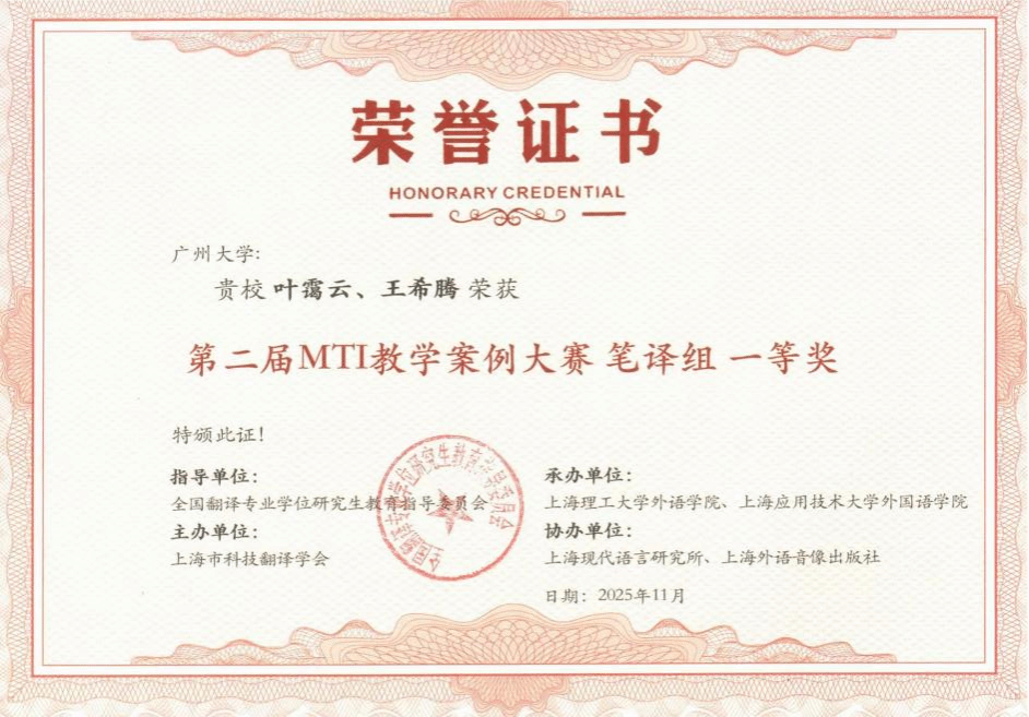 汪东萍副院长、杨艺博士、杨之淼博士和莫晓丹、姚烁两位MTI研究生合作的案例荣获三等奖,实现了我校翻译硕士专业在全国翻译教学案例大赛奖项的突破。