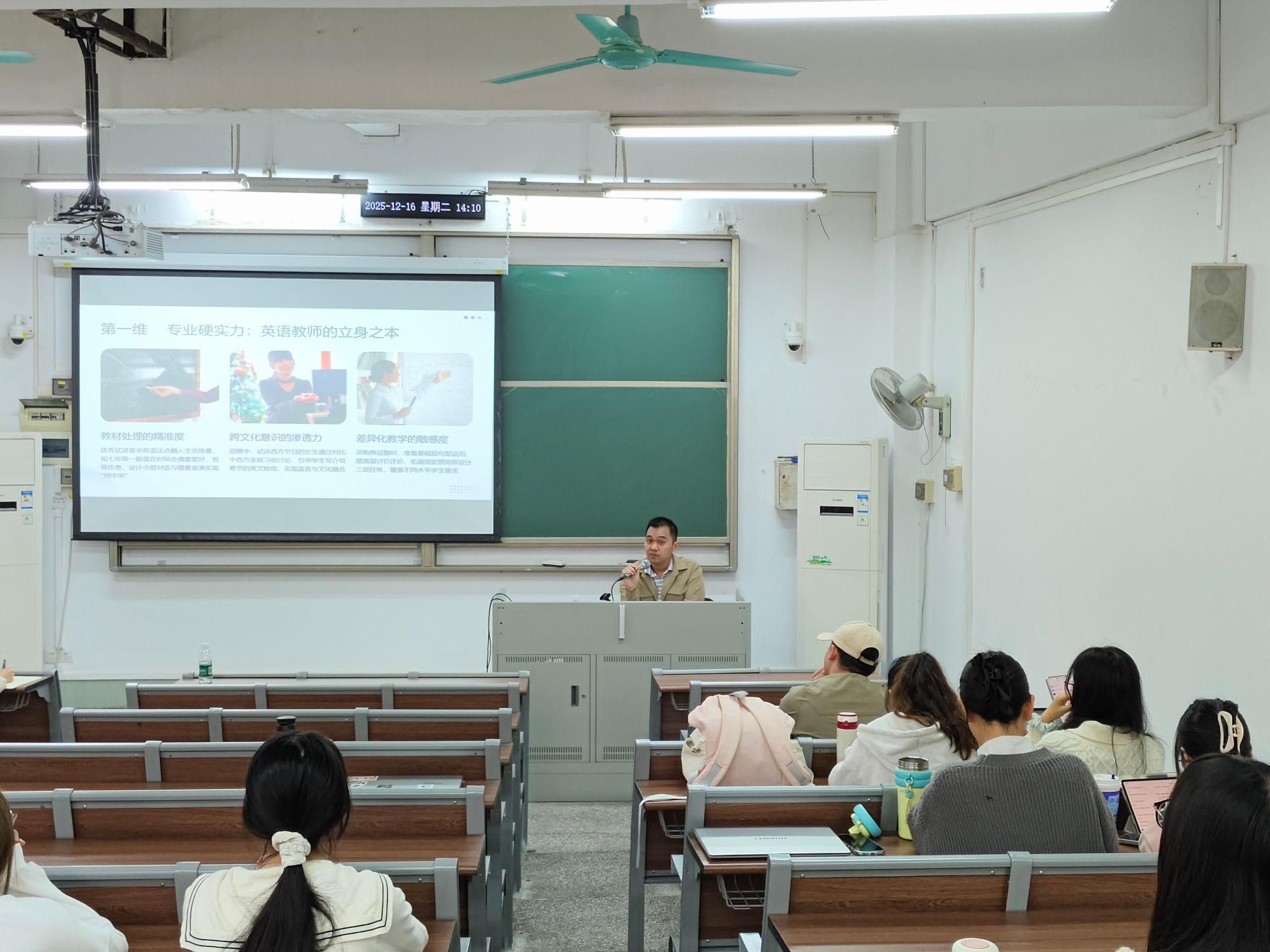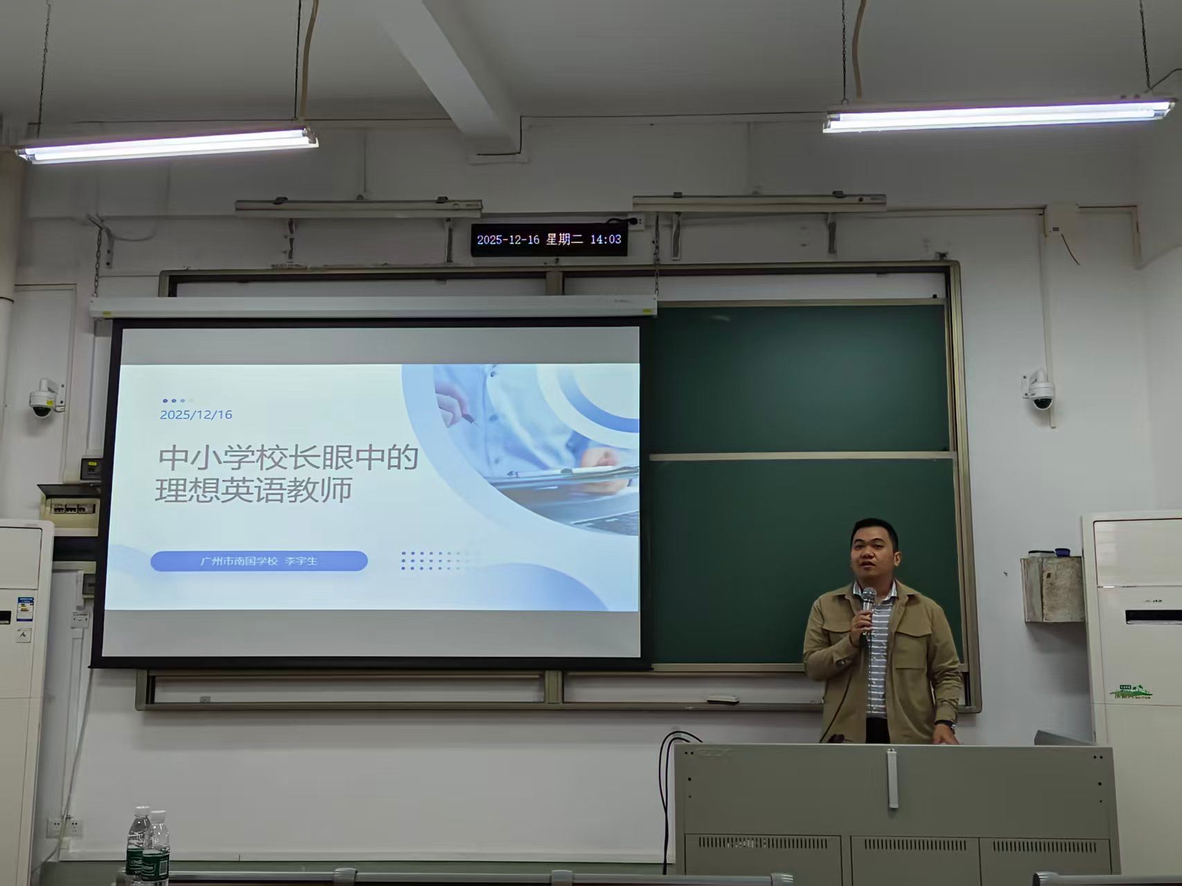 在桂花岗校区成功举办了“中小学校长心中理想的教师形象”主题讲座。本次活动特邀广州市南国学校副校长、广州市初中英语骨干教师李宇生担任主讲,学院梁凤娟副教授主持讲座。2025级全体学科教学(英语)硕士研究生到场聆听,现场气氛热烈,互动频繁。