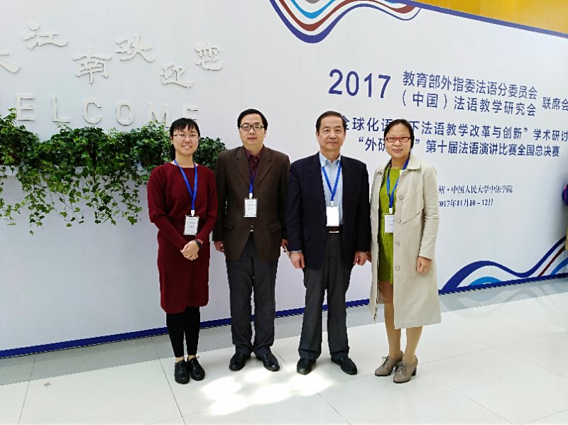 西语系主任邹琰老师和法语专业卢秋燕老师参加了在中国人民大学中法学院举行的2017年全国高校法语年会。此次年会包括2017教育部外指委法语分委员会、(中国)法语教学研究会联席会议、“全球化语境下法语教学改革与创新”学术研讨会、“外研社杯”第十届法语演讲比赛全国总决赛等多项重要活动。
