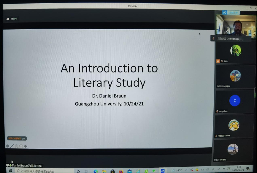 教师、英法日专业本科生、英语学硕研究生带来以“General Introduction to Literary Study”为题的讲座,讲座由英语系主任陈姝副教授主持。