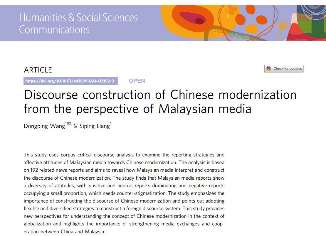 副院长汪东萍教授团队,以我校为第一完成单位,在SpringerNature期刊Humanities and Social Sciences Communications发表“Discourse construction of Chinese modernization from the perspective of Malaysian media”论文。研究通过语料库分析马来西亚媒体如何建构中国式现代化话语,为基于受众国讲好中国式现代化故事提供了新视角,旨在增强中国式现代化国际传播力影响力,提升国家形象和文化软实力。