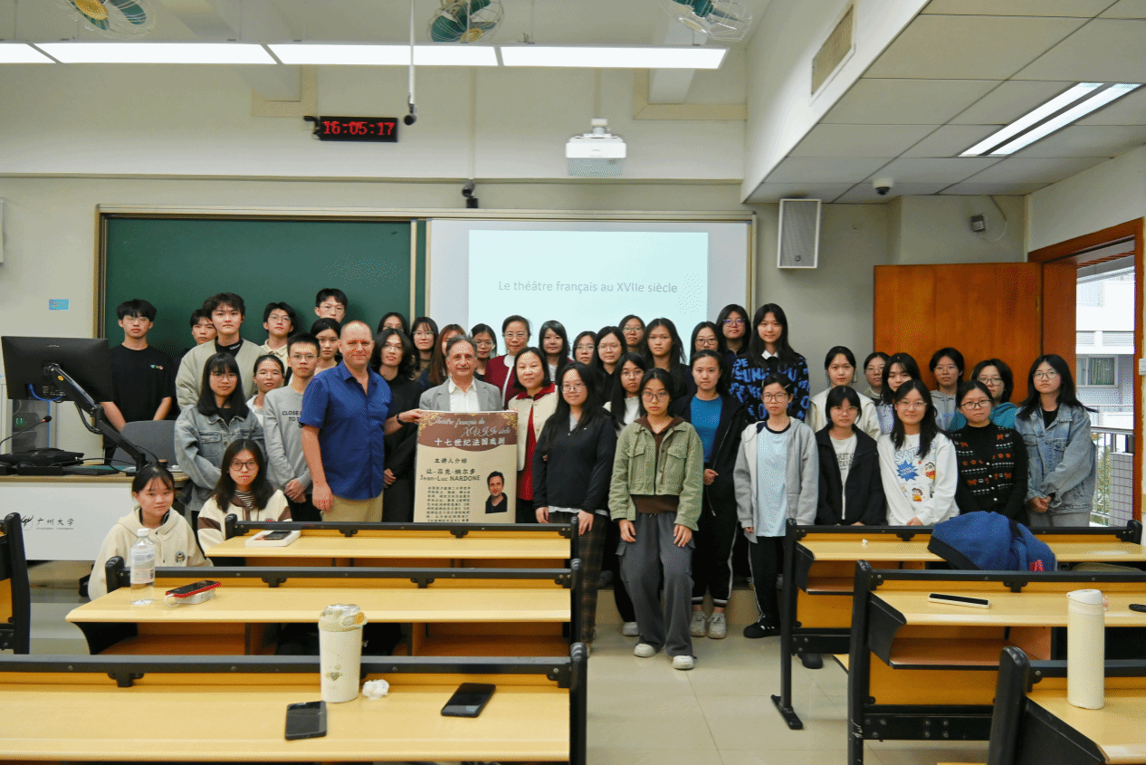 法语专业在大学城校区文新221举办了十七世纪法国戏剧讲座。本次讲座由Jean-Luc NARDONE教授主讲,西语系主任邹琰老师主持,中山大学文学院郭丽娜老师、华南师范大学文学院齐悦老师、外教Sébastien Damry及法语221班、231班同学参加了此次讲座。