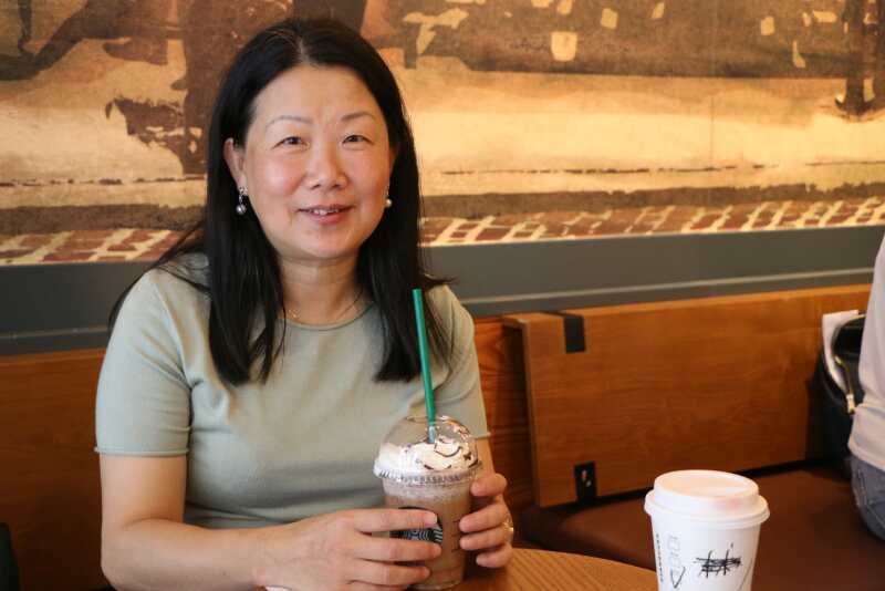 早晨的天空有点阴沉,空气潮湿而闷热。透过Starbucks的玻璃,不难发现来往的行人步履匆匆,面无表情。师姐就是这时走进了我们的视线,亲切而热情,笑容温暖而明媚。她俯身低头,面带微笑地与我们确认眼神的瞬间,我们才发现,她与我们原先想象的强势、霸气银行大boss形象截然不同——师姐的眼睛笑起来如一轮弯弯的明月。一件浅玉色短袖和一对银白色耳坠,服饰素雅,依旧难掩师姐的气色和活力。