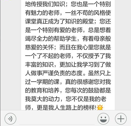 吴师姐:扎实的专业知识,乐于奉献的精神,对学生的关爱,我觉得是一位有责任心的老师应该具备的基本条件吧。