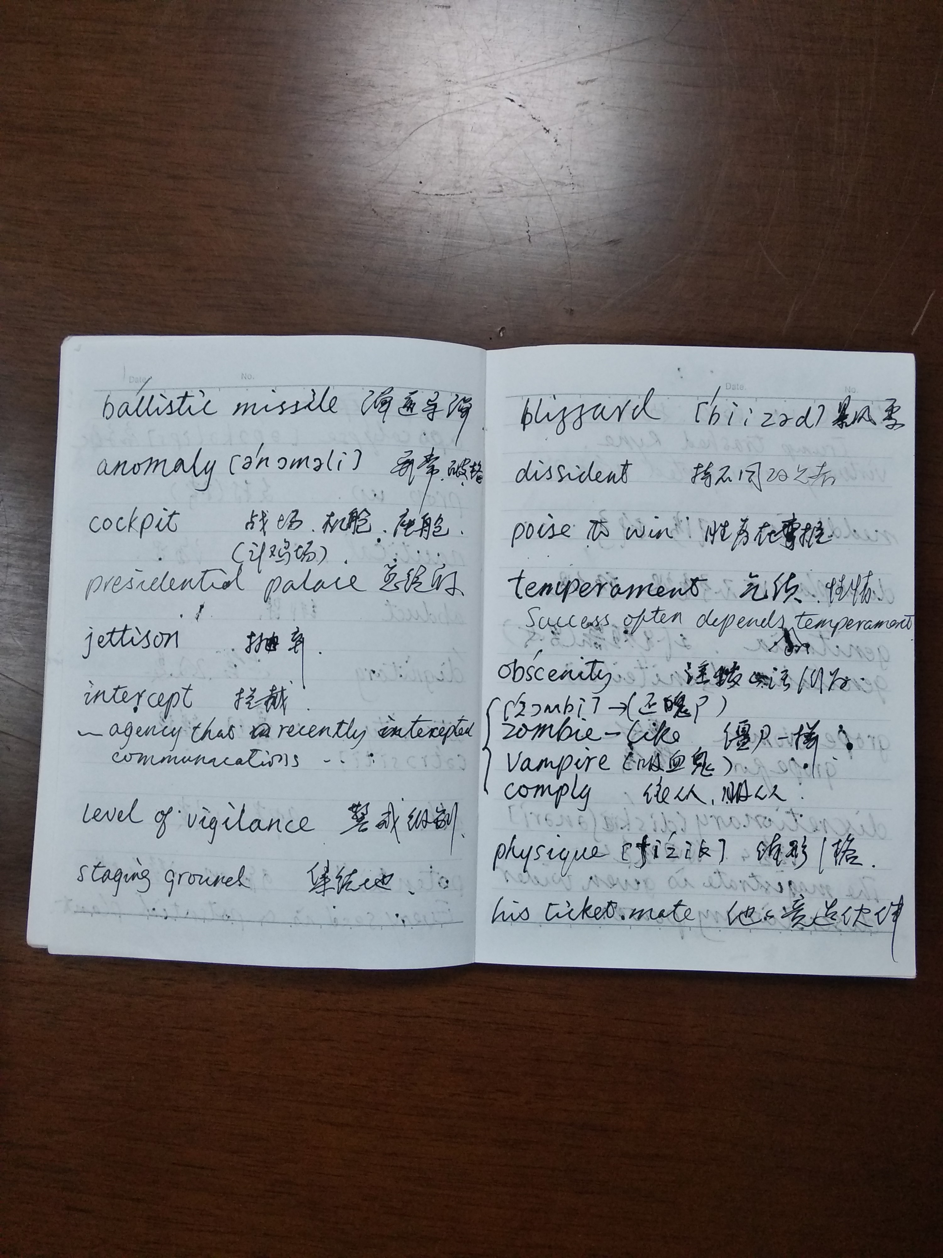 师兄把这水滴石穿般的恒心和坚持称为“恒持力”,他说:“现在,一个人有智商,有情商,这是不够的。要成事,还得有恒持力。”在学习英语上,要成功必须得有恒持力。做乡村教师时,师兄每天坚持早起到小溪边背英语单词,英语诗歌和名篇,这一背,便是三十多年,直到现在还坚持每天都积累英语的相关知识。每天早上,师兄都会习惯性地浏览 CNN新闻,记笔记积累单词。师兄给我们看了他记单词的本子(如图)。这密密麻麻的单词本就像是师兄攀登时所留下的一