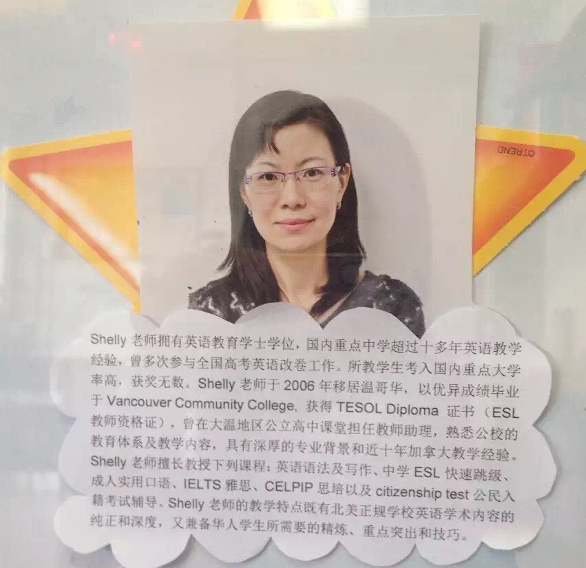 2007年移居温哥华,以优异成绩毕业于Vancouver Community College,获得TESOL Diploma 证书(ESL教师资格证),曾在大温地区几所英语教育机构担任辅导老师,现于公立高中J.B Burnett Secondary School担任Teacher Assistant,具有深厚的专业背景和近十年加拿大教学经验。