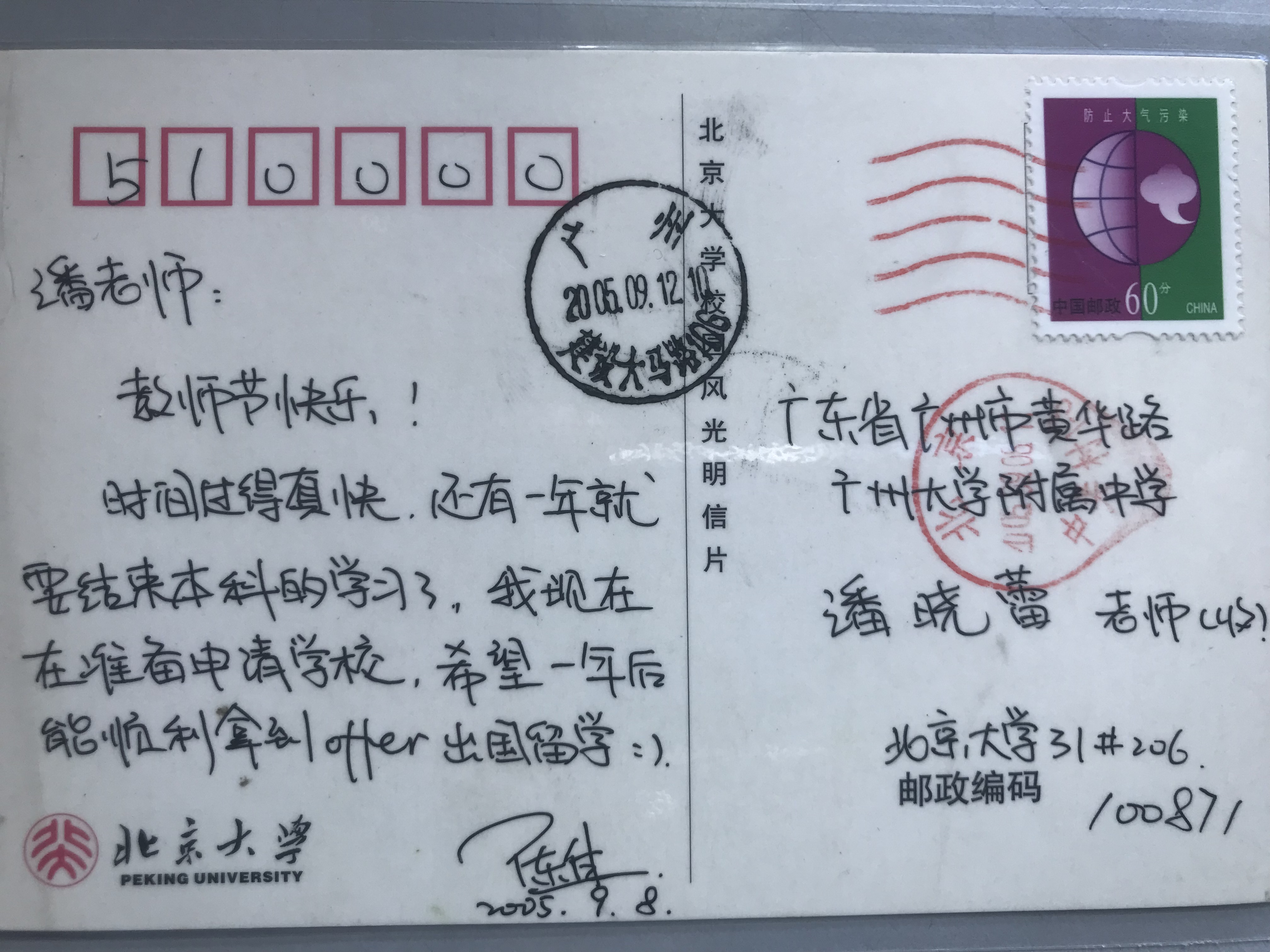 学生毕业后寄的明信片