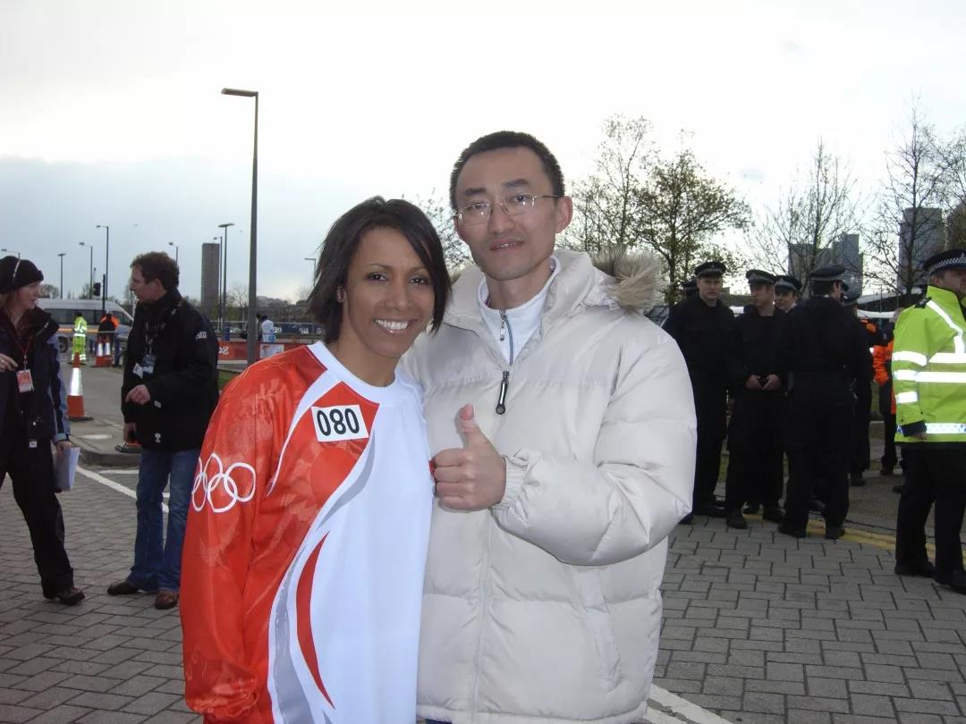 (梅杰师兄(右)在伦敦采访北京奥运火炬传递伦敦站的最后一棒火炬手奥运冠军凯丽·霍尔姆斯)