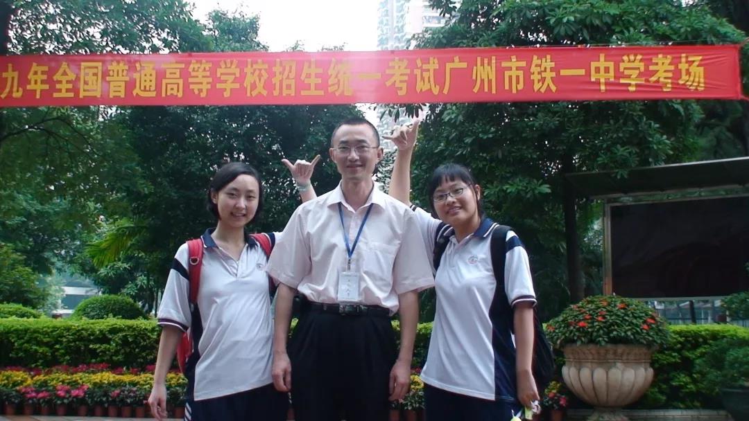 (梅杰师兄与当年参加“新闻早餐会”的其中两位政治中考满分的同学合影(两位同学高中都考上广铁一中,高考都考上中山大学))