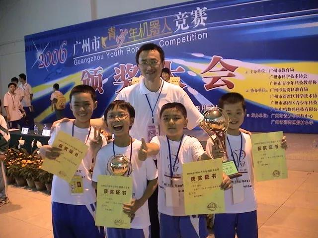 (梅杰师兄任广州铁道车辆厂子弟学校校长时和获得广州市中小学机器人比赛冠军的学生们合影)