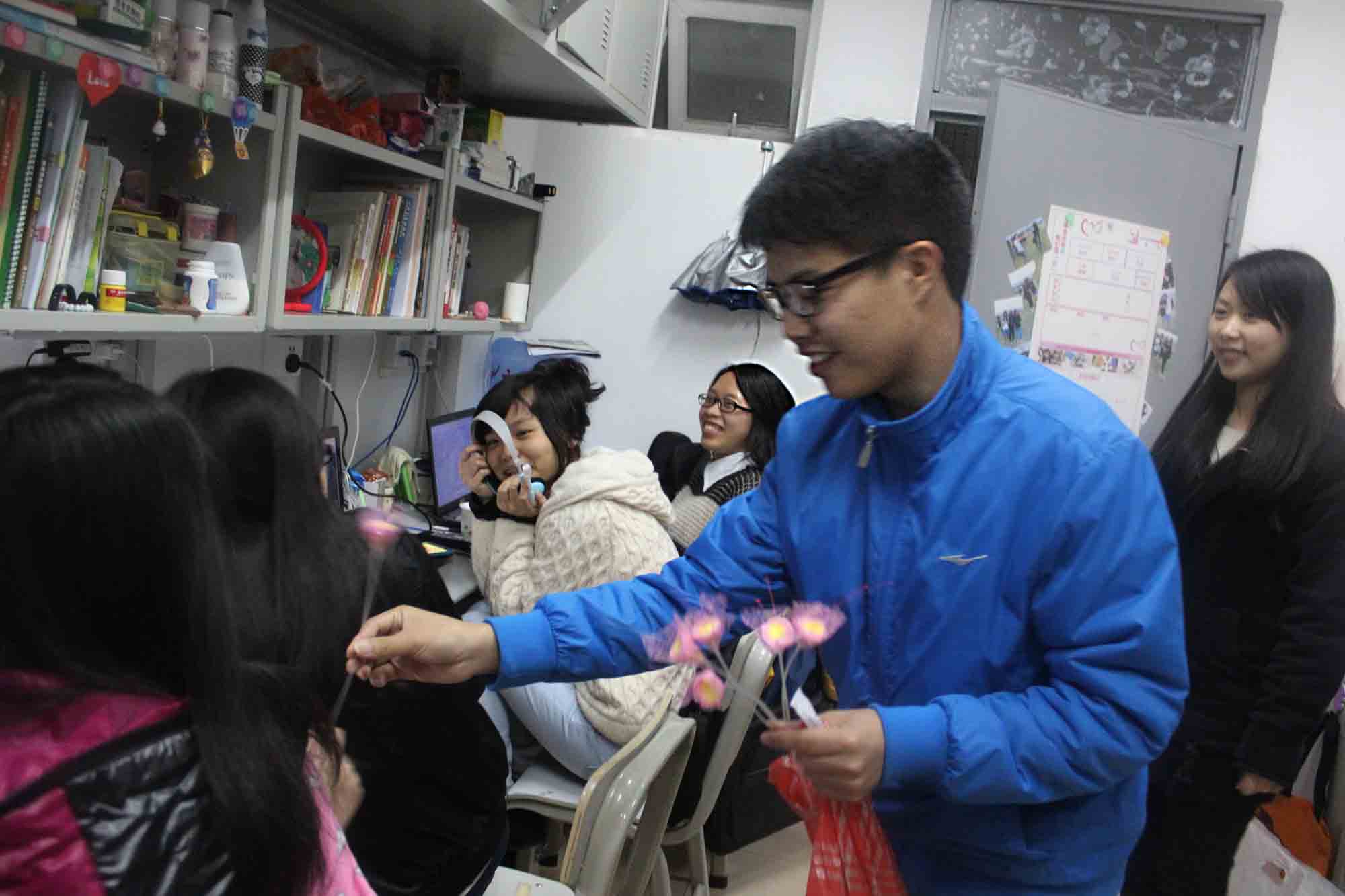 女生部与计算机学院精心策划的女生节特别节目“浪漫之夜”在女生宿舍B16拉开了帷幕。男生分头将事先准备好的一束束鲜花和棉花糖亲手送到女生手上。随后,男生们高举手机,明亮灯光列成心形,一句“we wish you a happy girl’s day” 如雷贯耳。下一秒,吉他声缓缓响起,歌声传去浓浓情意。