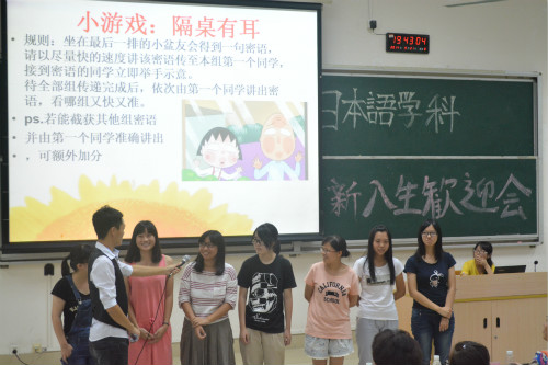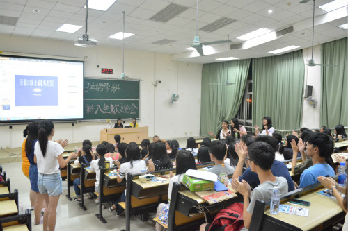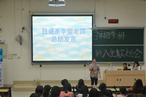 李莹莹老师给同学们介绍了日语系的老师们,并表达了对新同学能在大学多姿多彩的新生活的祝愿。新生们通过各式各样的活动、表演、游戏进一步了解了日语专业。比如大二师姐的学习经验之谈,日本常识大挑战,13级的配音表演和歌曲串烧等,都让同学们深深感受到了日语的魅力,最后的141班回顾视频将现场气氛推向最高点。最后,141班班主任李玺老师作总结发言,向同学们提出关于学习、社团活动、个人兴趣发展等方面的建议,令在座同学受益匪浅。