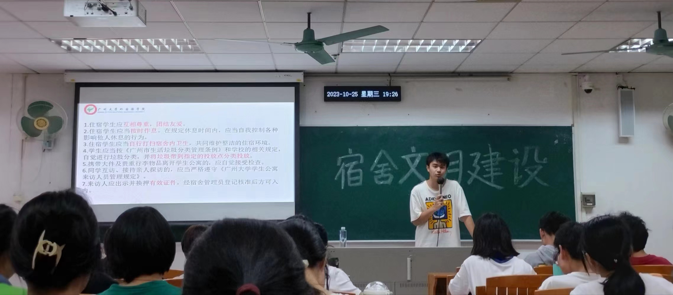 会议期间,年级生活委员刘懋坤同学为大家详细讲解了宿舍文明建设要求。他从“宿舍宿位相关”“日常行为规范”“违规违纪行为”三大方面进行详细讲解,明确了宿位调整以及走读申请相关的纪律,详细解读了High漫画