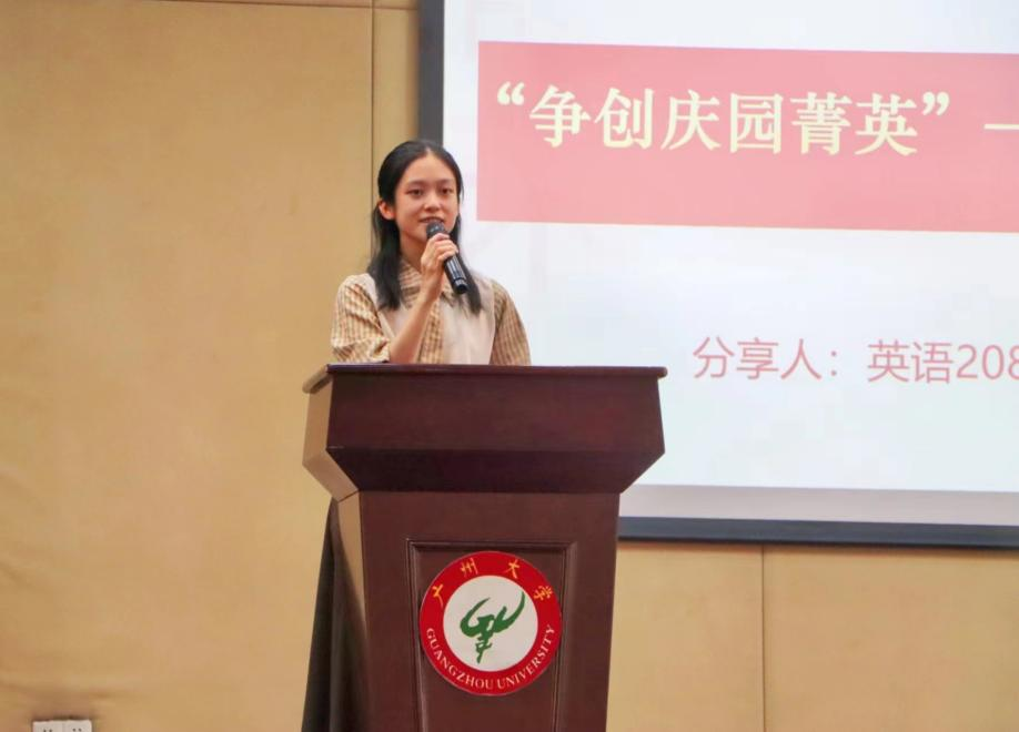 会议第项议程为“争创庆园菁英”2022-2023学年“十佳学生入围奖”张祎同学进行成长经验分享张祎同学连续两年综测专业第一,曾获校一等奖学金;获中国好创意暨全国数字艺术设计大赛二等奖、十一届“华文”师范院校英语师范生教学能力测试一等奖、2023年“高教社杯”大学生“用外语讲好中国故事”优秀短视频全国交流活动全国一等奖、2022年外研社·国才杯写作大赛省级一等奖、High漫画 优秀学生等荣誉。张祎同学结合自身经历,勉励同学们在专业上追求极致,并分享了夯实专业基础、提高专业能力的方法和技巧。同时,她也鼓励大家勇于实践,以赛促学,并注重赛后的复盘,总结收获和不足。张祎同学还希望同学们可以乐于奉献,传递专业力量,帮助他人的同时,提升专业素养。