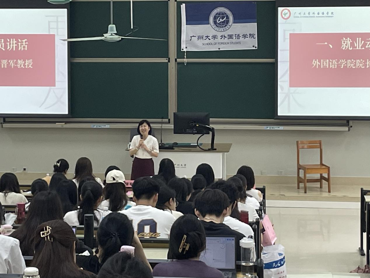 院长王晋军教授作就业动员讲话。她指出当前就业形势复杂多变,应尽早调整好积极就业心态,明确自己的需求和发展方向,高效整合就业信息资源,把握就业机会,主动择业就业。