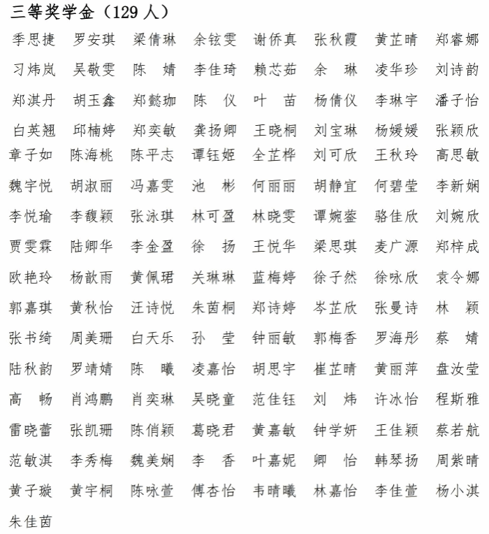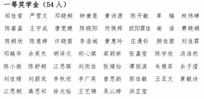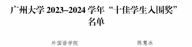 2021级本科生陈慧冰获“十佳学生入围奖”。在先进个人评选中,殷子渊等54人获评“优秀学生”,王愉等43人获评“优秀学生干部”,邹佳萦等54人获学校一等奖学金、苏茵彤等86人获学校二等奖学金、季思捷等129人获学校三等奖学金,李诗琪等3人获考研奖励一等奖学金、陈静眉等9人获考研奖励二等奖学金、罗娜灵等16人获考研奖励三等奖学金,吴品晶等13人获学业进步奖。