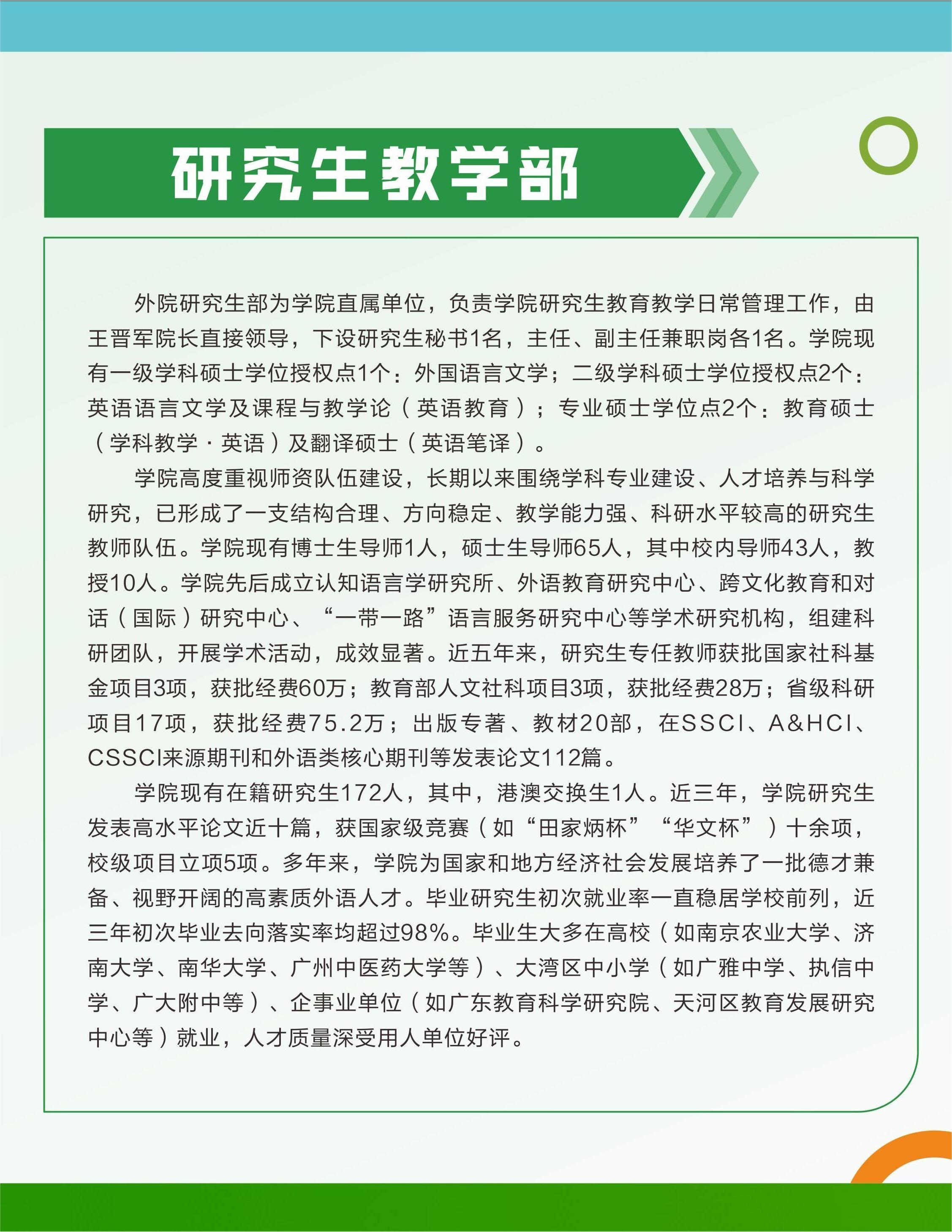 研究生教学部为学院直属单位,负责学院研究生教育的日常管理工作。该部设主任1人、副主任1人、秘书1人。学院设有外国语言文学一级学科硕士学位授权点、英语语言文学二级学科硕士学位授权点、课程与教学论(英语教育)二级学科硕士学位授权点、教育硕士(学科教学·英语)专业学位授权点以及翻译硕士(英语笔译)专业学位授权点。英语语言文学和课程与教学论(英语教育)学制为全日制三年;专业学位教育硕士(学科教学·英语)学制全日制两年;翻译硕士(英语笔译)学制全日制两年。