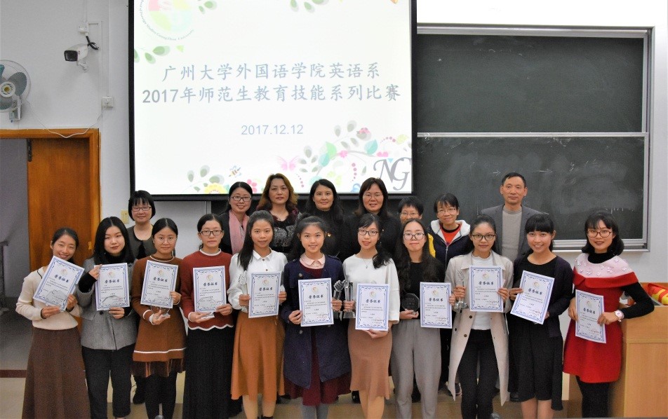 英语系2015级师范生教育技能大赛在文新411教室成功举办。出席此次比赛的有肖坤学院长、李暖均书记、苏远连副院长、英语系李桔元书记、陈姝主任等院系领导;同时,评委阵容强大,不仅有英语系教师教育教研室的全体教师,还有来自番禺区市桥象圣中学的易翠红主任和陈嘉庚纪念中学的张妮妮老师。