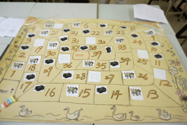 鹅棋游戏(Jeu de l'oie)在法国是非常受欢迎的游戏,是法国的古老棋戏,中世纪末盛行於欧洲。在格子画板里没有数字的空格处,将会标有不同的活动名称,游戏的负责人将会根据活动的名称展示出相应的照片,然后同学们根据照片的内容提示,在校园里找到和照片一致的地方,并在该地找到事先放置好的信封,根据信封里的内容来回答问题或者完成活动内容,最先到达终点的三个小组为获胜者。