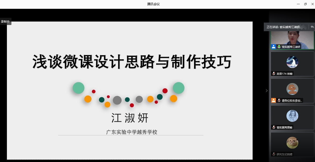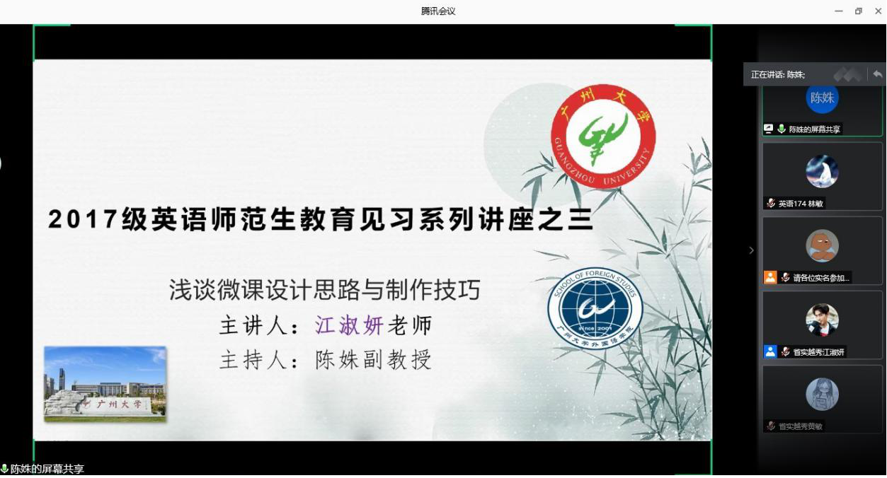 715日下午,来自广东实验中学越秀学校的初三级英语教师江淑妍老师带来了一场题为“浅谈微课设计思路与制作技巧”的线上讲座。讲座由陈姝副教授主持,英语师范教研室老师、17级所有师范生、其他年级部分师范生、毕业校友和High漫画 教育实践基地一线教师等共200多人齐聚腾讯会议,共同参与这一场线上教学讲座盛宴。