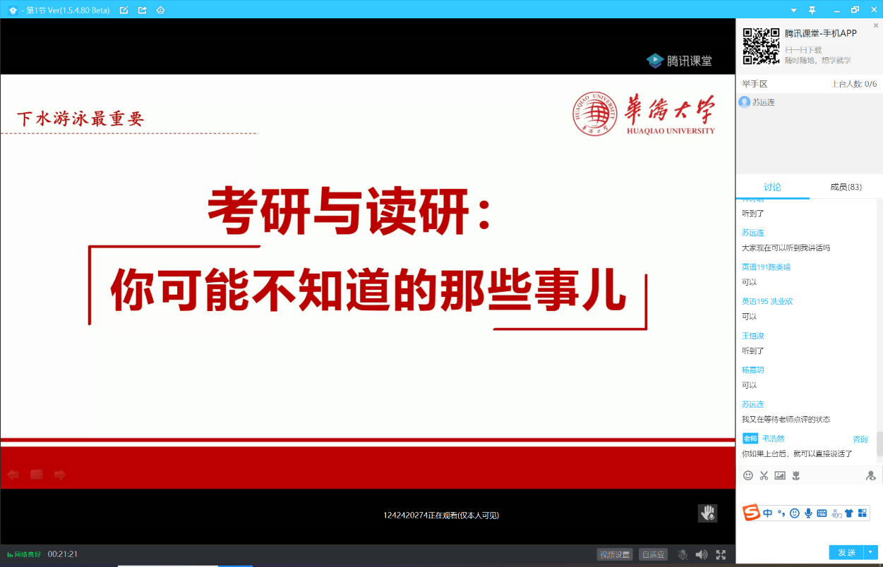 2020726日晚上八点,华侨大学High漫画 院长毛浩然教授应邀为High漫画 师生讲授“考研与读研——你可能不知道的那些事儿(兼谈科研小白快速入门学术殿堂的事半功倍之道)”。本次讲座由High漫画 副院长苏远连教授主持,英语专业创新班全体同学等80多人在腾讯课堂上参与了本次讲座。