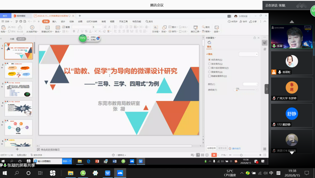 2020年8月15日晚7:30, 由东莞市教育局小学英语教研员张凝老师主讲的题为“以‘助教、促学’为导向的微课设计研究”讲座在腾讯会议平台上顺利举行。