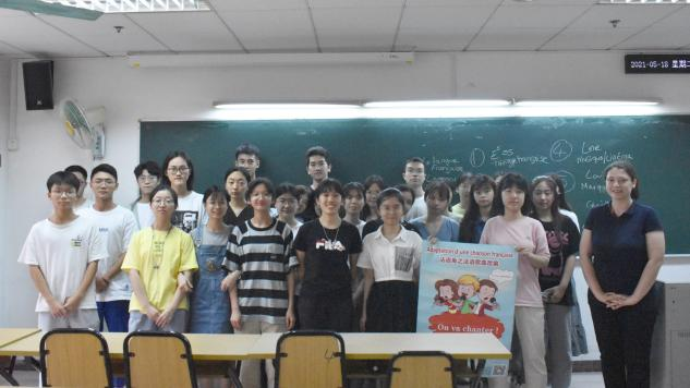 西语系法语专业于桂花岗校区5号楼北503#A,顺利举办了本学期第三次法语角活动。本次活动内容为法语歌曲改编,外教Anne-Flore Vrac组织同学们运用美食、运动等不同主题的法语词汇,改编歌曲《Je veux apprendre》,从而锻炼同学们法语词汇和语法的应用能力。首先,Anne-Flore Vrac老师为同学们播放该法语歌曲的视频。然后,同学们自行分组选择不同主题词汇对歌曲进行改编并演唱。最后,各小组依次展示歌曲改编成果。