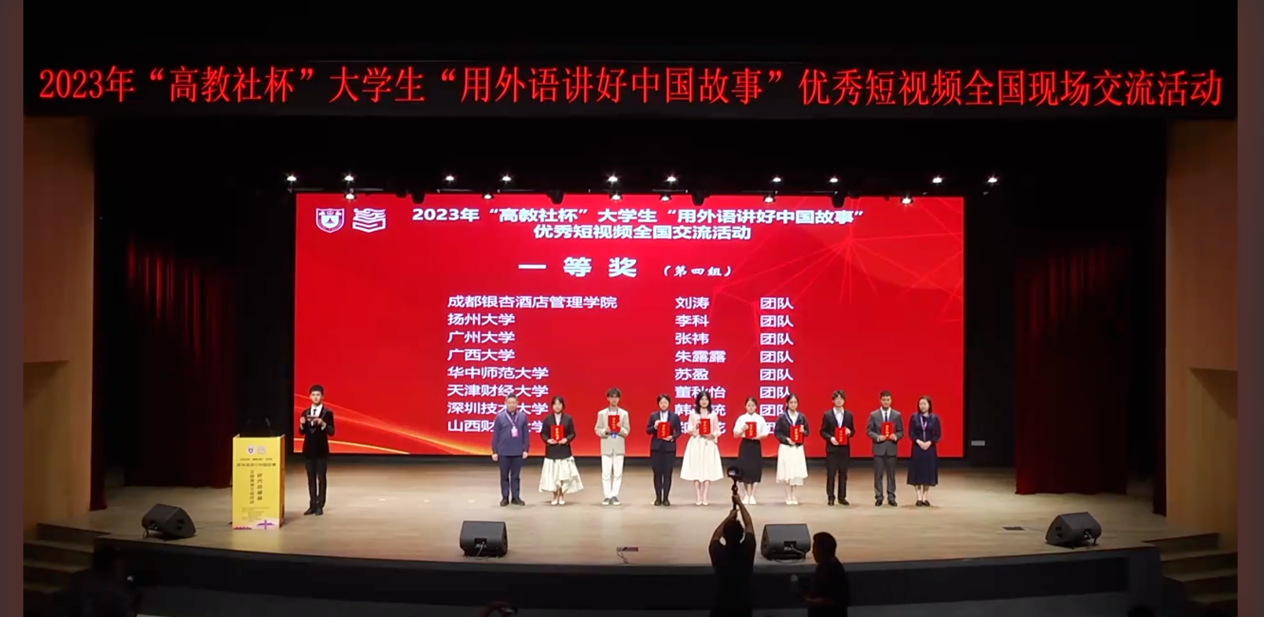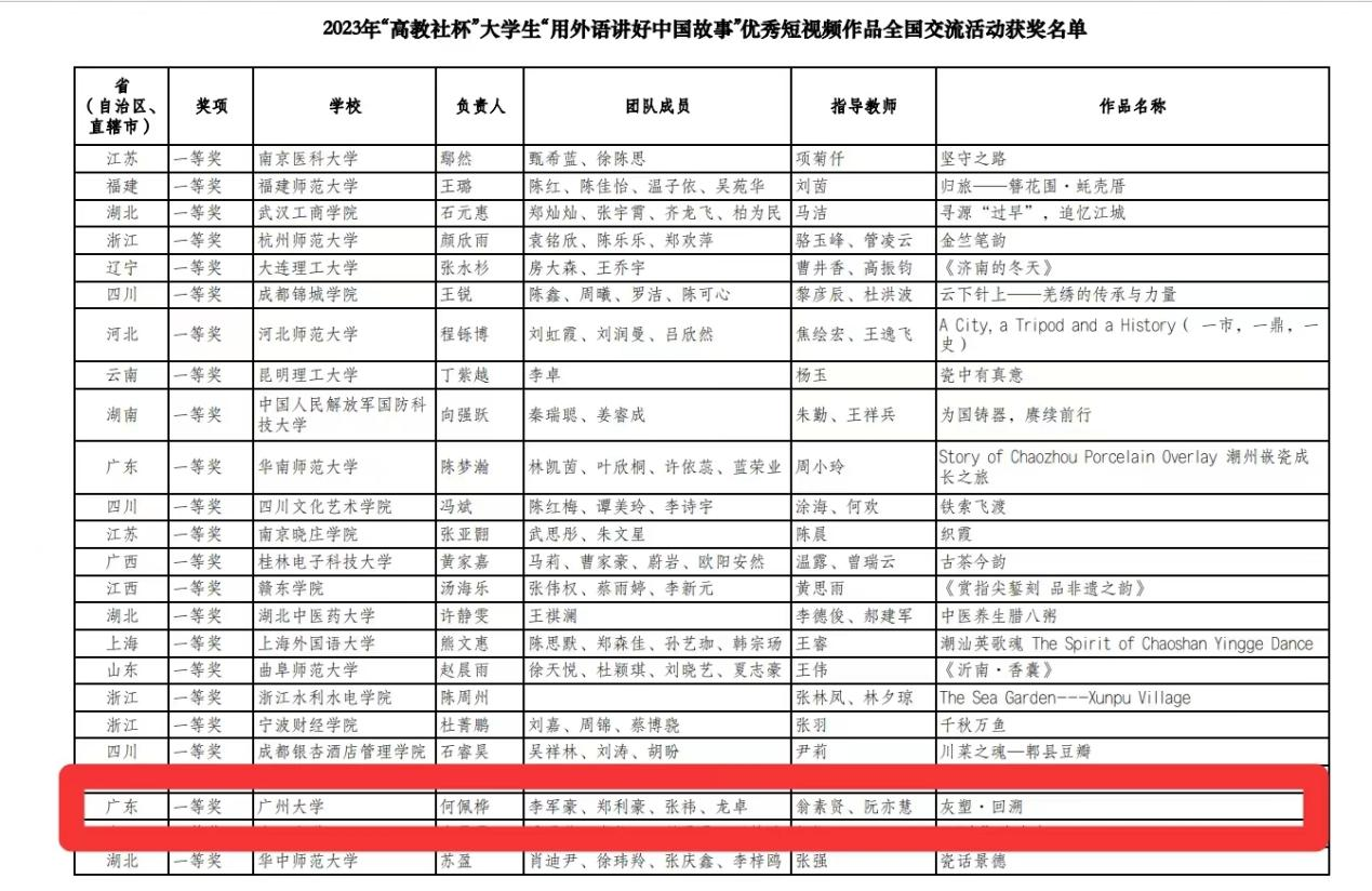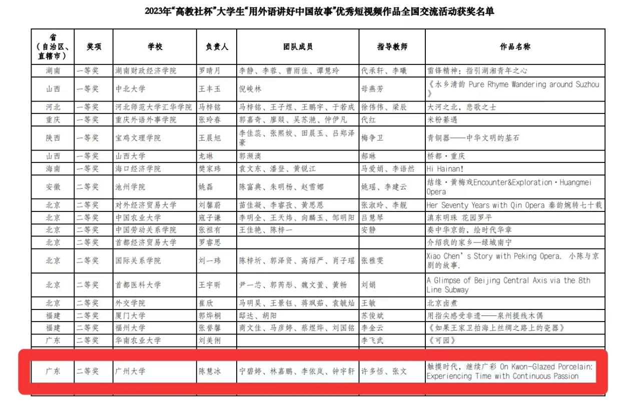 近日,全国高等学校大学外语教学研究会指导、南京大学主办、高等教育出版社协办的2023年“高教社杯”大学生“用外语讲好中国故事”优秀短视频全国交流活动在南京大学顺利举办。我校本科学生作品《灰塑·回溯》(团队成员:何佩桦、李军豪、郑利豪、张祎、龙卓,指导老师:翁素贤、阮亦慧)获得全国一等奖,《触摸时代,继续广彩》(团队成员:陈慧冰、宁碧婷、林嘉鹏、李依岚、钟宇轩,指导老师:许多恬、张文)获得全国二等奖。