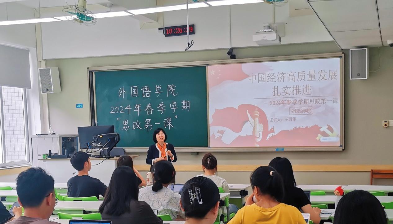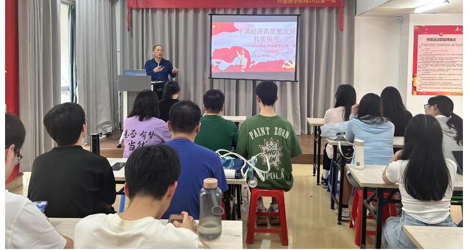 李暖均书记以“中国经济高质量发展扎实推进”为题,围绕经济发展趋势、科技创新等内容引导学生思考中国经济的现状与未来,强调新时代青年应深刻理解国家经济大势,认清面临的机遇与挑战。课上,李书记鼓励同学们发挥专业优势,在国际平台用外语讲好中国故事、传播好中国声音,贡献外语学子的力量。