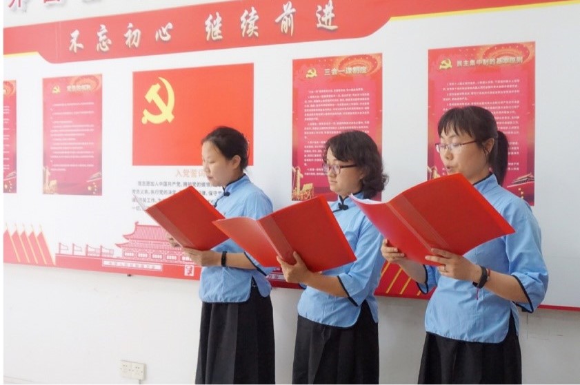 本次会议由党支部书记李莹莹主持。会上,法语学习小组和日语学习小组的教师党员身穿五四青年装,分别用法语和日语诵读了《要有高度的文化自信》(法文版)和《提高国家文化软实力》(日文版)(节选自《习近平谈治国理政》第一卷《六、建设社会主义文化强国》和第二卷《九、坚定文化自信》)。