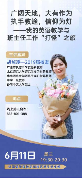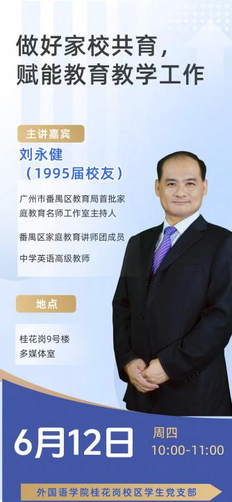 桂花岗校区学生党支部于6月11日、12日组织开展“校友传帮带”职业发展首期活动。活动聚焦在读研究生关切的“新教师职业发展:教学与班级管理的动态平衡”议题,特邀2019届校友胡焯凌(广州执信中学英语教师)、95届校友刘永健(番禺区教育局首批家庭教育名师工作室主持人)分别通过线上、线下形式分享经验,支部党员、学生党员及入党积极分子共80余人参与。