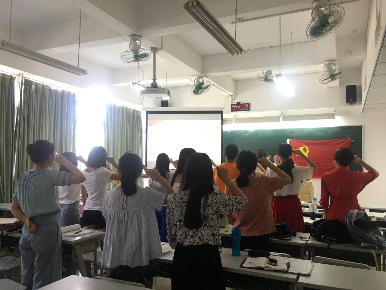 会议伊始,2017级的新生党员分别进行了简短的自我介绍。刘洁同志向大家介绍学院党委及研究生党支部的基本情况。为进一步增强党员的身份意识,发挥党员的先锋模范作用,徐副院长和季老师为全体新生党员佩戴党员徽章,“亮”出身份。随后由刘洁同志带领大家重温入党誓词。入党宣誓是一种仪式,一份承诺,更重要的是通过这个仪式,使我们重温初心,激励党员同志们不断前行。