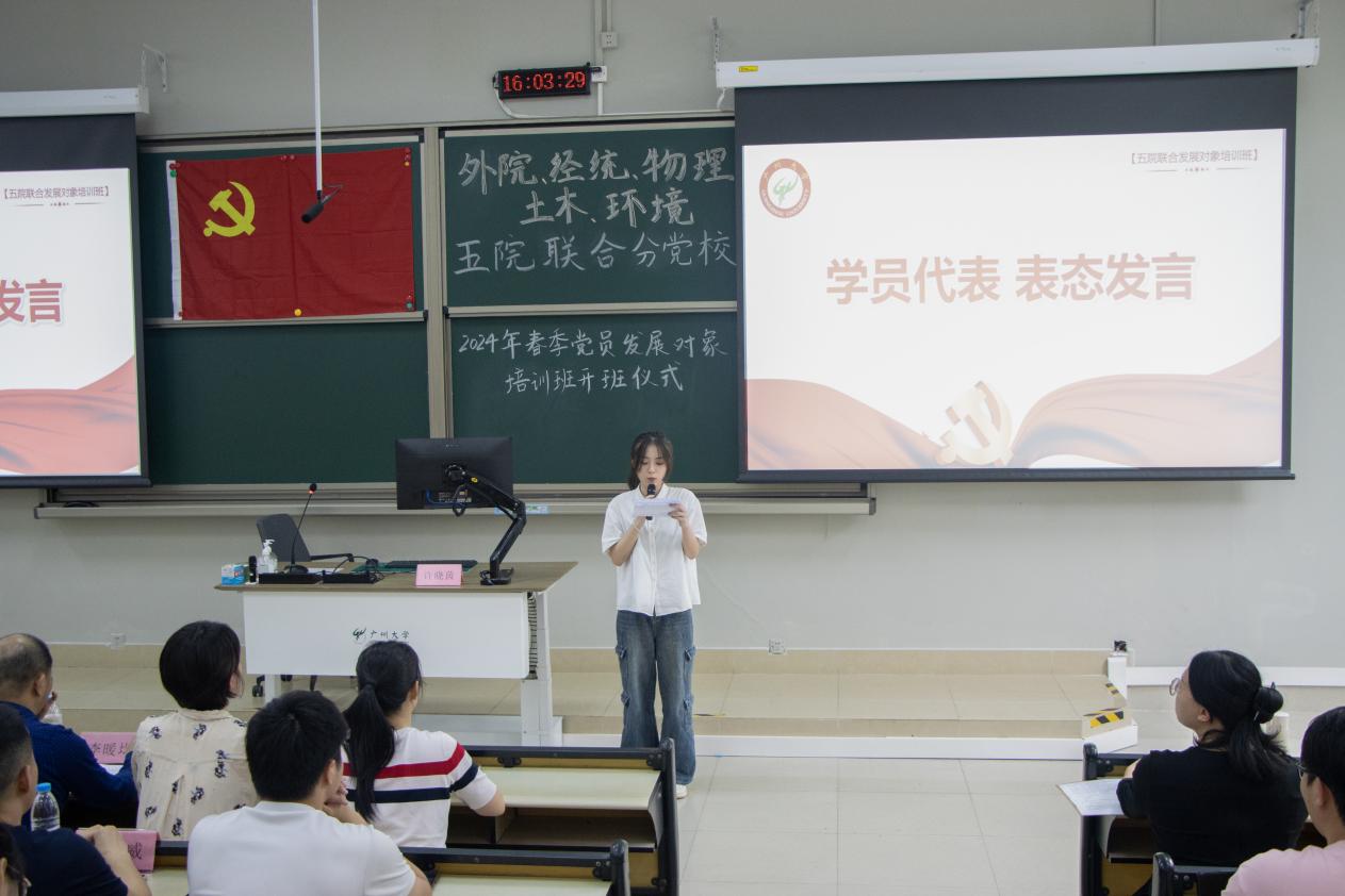 许晓茵同学作学员代表发言。从青年大学生的立场,她表达了作为新时代青年应具备的责任使命,并立志以更坚定的信念与更务实的作风为党的事业贡献自己的力量。同时,她也代表全体学员表态,将在本次发展对象培训班中,严格要求自己,努力增强党性修养和政治素质,为建设社会主义现代化强国贡献广大学子的光与热。
