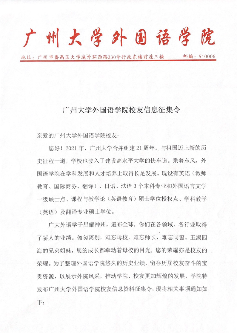 南风依依,秋思脉脉。请外院校友们相互转达,广而告之,同时委托各地校友会协助工作。更希望您将您所认识和所能发动的校友的信息征集起来并告知我们。拜托大家,并致感谢!