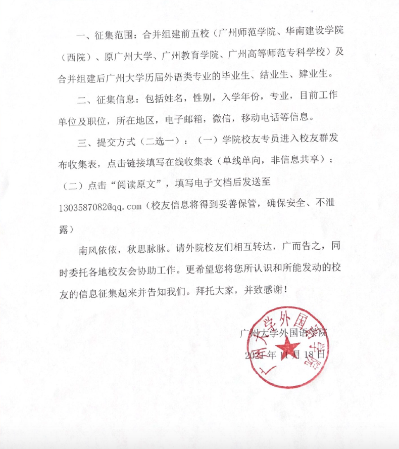 三、提交方式(二选一):(一)学院校友专员进入校友群发布收集表,点击链接填写在线收集表(单线单向,非信息共享);(二)点击“阅读原文”,填写电子文档后发送至[email protected](校友信息将得到妥善保管,确保安全、不泄露)