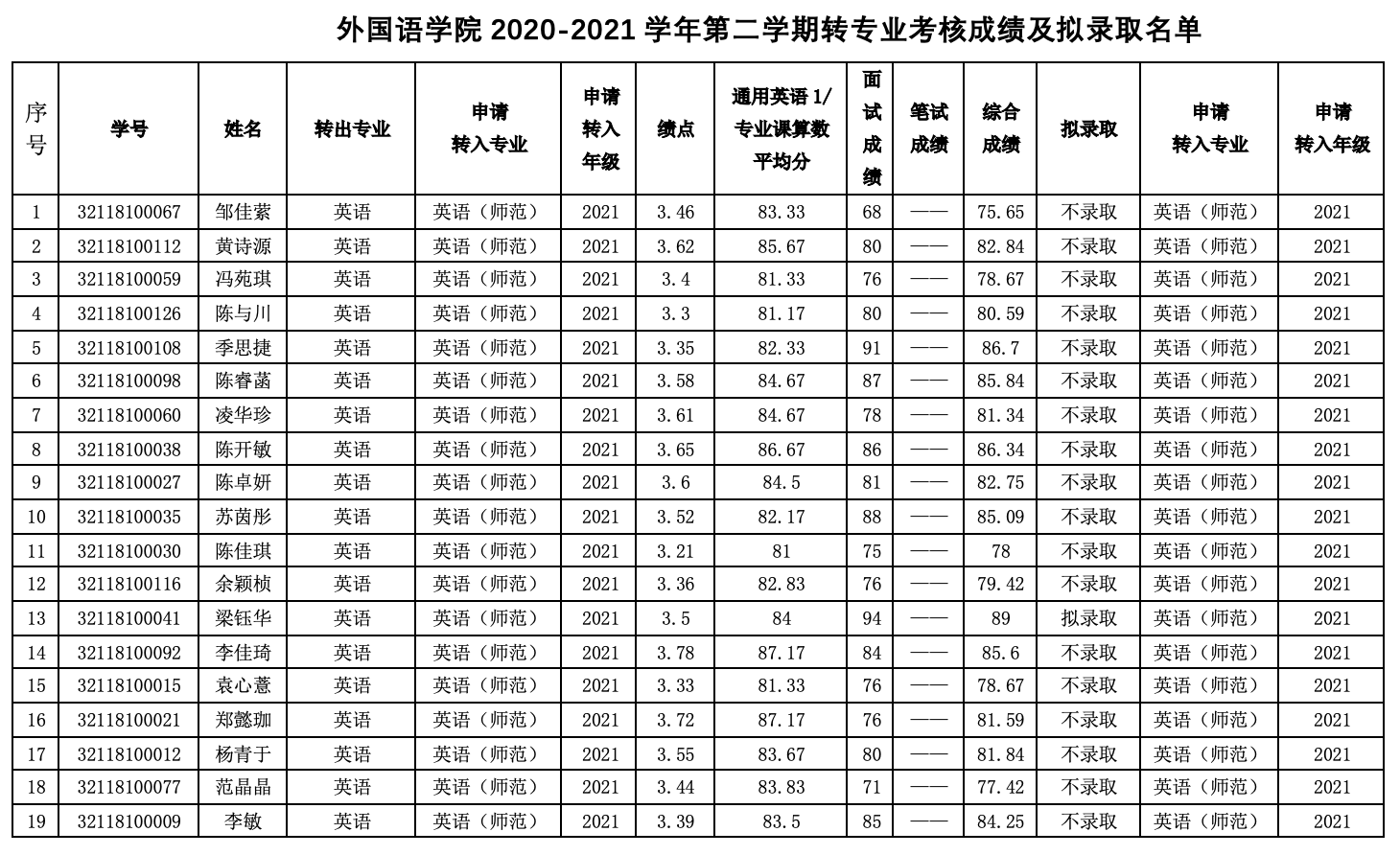 附:2021-2022学年第二学期转专业考核成绩及拟录取名单