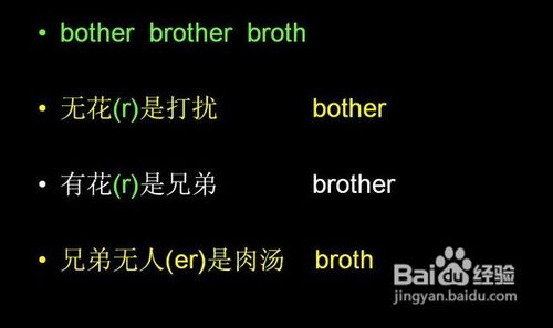 拼合记忆法。即合成词记忆法。已知词拼合起来就成为新词,比如:classroom,bedroom,blackboard等。然而,还有一部分合成词却不是十分明显,需在原有词义上有所延伸。例如:birdman飞行员,光看字面意思是鸟+男人,可不能单纯理解为鸟人,而是能像鸟一样飞的人,即飞行员。拼合记忆法就是告诉我们:当我们再遇到一个新单词时,不要把它看做新单词,而是把它看作熟单词的新组合,没有新的单词,只有新的组合!