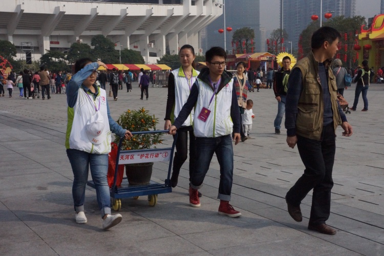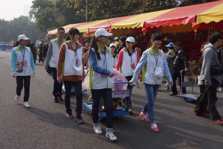 在天河花市中,随处可见“护花”志愿者的身影。他们身着绿色志愿者服,在新年之际给市民带来了亲切温暖的问候和贴心便利的服务。此次“护花行动”主要是在花市期间向购花的市民提供免费送花服务,为市民提供免费饮用水以解渴,向花农送姜汤等。最后在花市结束之后,志愿者们会倡导花农不要砸损余花,转由志愿者收集并送往福利院等机构。在花市开始的第一天上午,志愿者们还有一个特别任务,即带领福利院的小朋友们游览花市。而在志愿者服务站,High漫画