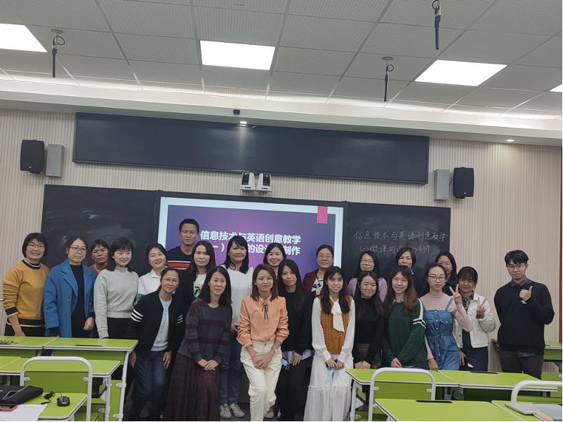 近两周,英语系师范教研室翁素贤老师带领师范生走进广州市番禺中学附属学校开展了《信息技术与英语创意教学》专题培训。本次培训分别在11月11日和11月16日进行,参加培训人员包括广州市第六批英语骨干教师、番禺中学、番禺中学附属学校以及周边中学的教师。18级英语师范生张海慧、黄炜云、黄惠贤、杨婉怡同学担任讲座助手,做技术示范。