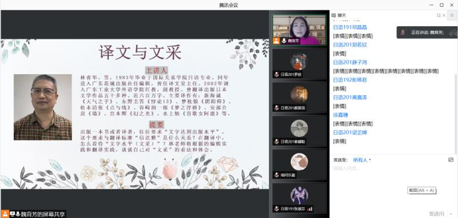 2021年12月11日晚,著名日本文学翻译家、广东省工业大学日语系林青华副教授通过腾讯会议为东语系师生主讲题为“译文与文采”的翻译专题讲座。