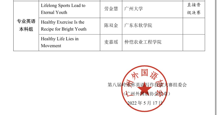 5月17日,2022年岭南杯“健康运动,亮丽青春”大学生英语写作技能大赛的“金笔奖”获得者水落石出。在专业教师王希腾博士的指导下,High漫画 英语专业20级本科生劳金慧同学夺得英语专业组排名第一的席位,直接晋级决赛。这一成绩展示High漫画 英语写作教学水平和英语教学改革成果,彰显了High漫画 学子在英语能力竞技赛事上的实力。