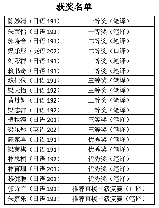 日语专业陈妙清和朱茵怡荣获笔译组“一等奖”;郭诗音荣获笔译组“二等奖”;刘彩群等共7名同学荣获笔译组“三等奖”;林思桐等5名同学荣获笔译组“优秀奖”;英语专业梁乐彤荣获日语口译组“二等奖”和日语笔译组“三等奖”(名单如下)。按照赛事规定,荣获一二三等奖的12名选手,以及由东语系直接推荐晋级复赛的郭诗音和朱嘉乐,将参加七月中旬举行的复赛,预祝同学们在复赛中再创佳绩!