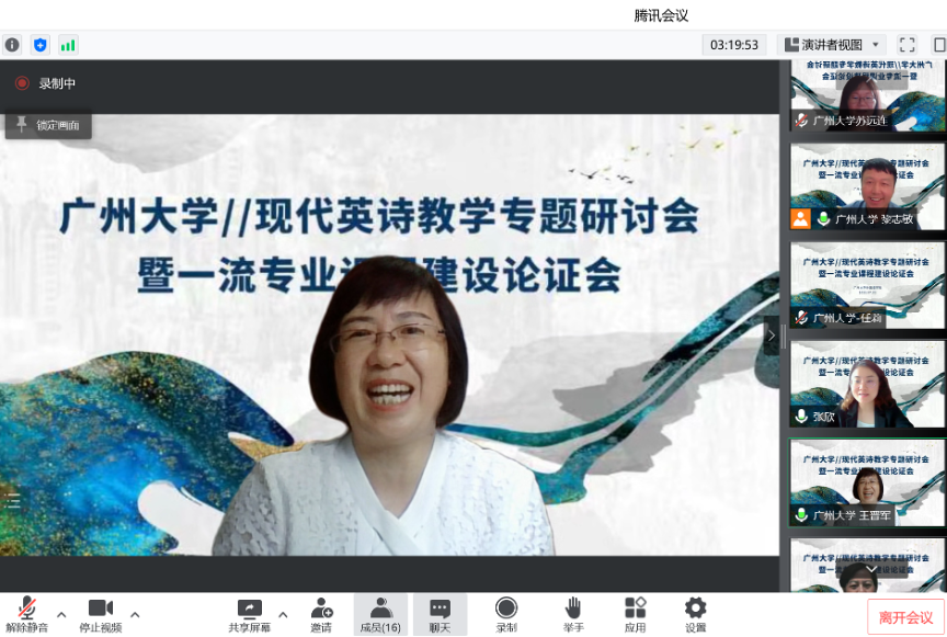 “现代英诗教学专题研讨会暨一流专业课程建设论证会”在线上(腾讯会议)隆重举行,国内外专家学者云端会晤,就现代英诗教学专题进行研讨,并为一流专业课程建设建言献策。