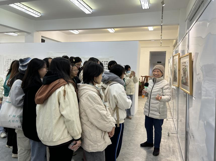 离退休教职工篆、隶、草、楷、行等书法作品,国画、水彩等绘画作品及各类主题摄影作品。交流活动中,书画协会会长刘间雄老师重点围绕“中国汉字的发展历程”,结合现场书法作品为同学们讲解书法知识和作品内涵;徐恺芝老师对自己的水彩作品进行讲解,为同学们介绍书画的独特魅力,用自己的亲身经历勉励同学们“坚持学习,活到老学到老”。同学们对老师作品赞不绝口,纷纷表示要学习前辈们热爱艺术、终身学习的精神。
