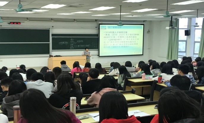 首先,苏远连副院长向同学们介绍了我校学分制改革的政策,其目的在于为同学们提供更个性化、更自主的学习选择,学分制实施的是弹性学制,同学们可以在3-7年内根据自身的实际情况完成学业,并再一次强调了2018年版人才培养方案的关于通识类必修课、通识类选修课、专业必修课、专业选修课等不同类型课程的修读要求,之后,对学校的学分制管理规定、收费办法等文件进行了解读。接着,郭幼韦老师向同学们介绍了选课系统,对29日选课系统开放时不同课程尤其是选修课程的操作指引作了详细的介绍,系主任对注意事项作了补充说明。