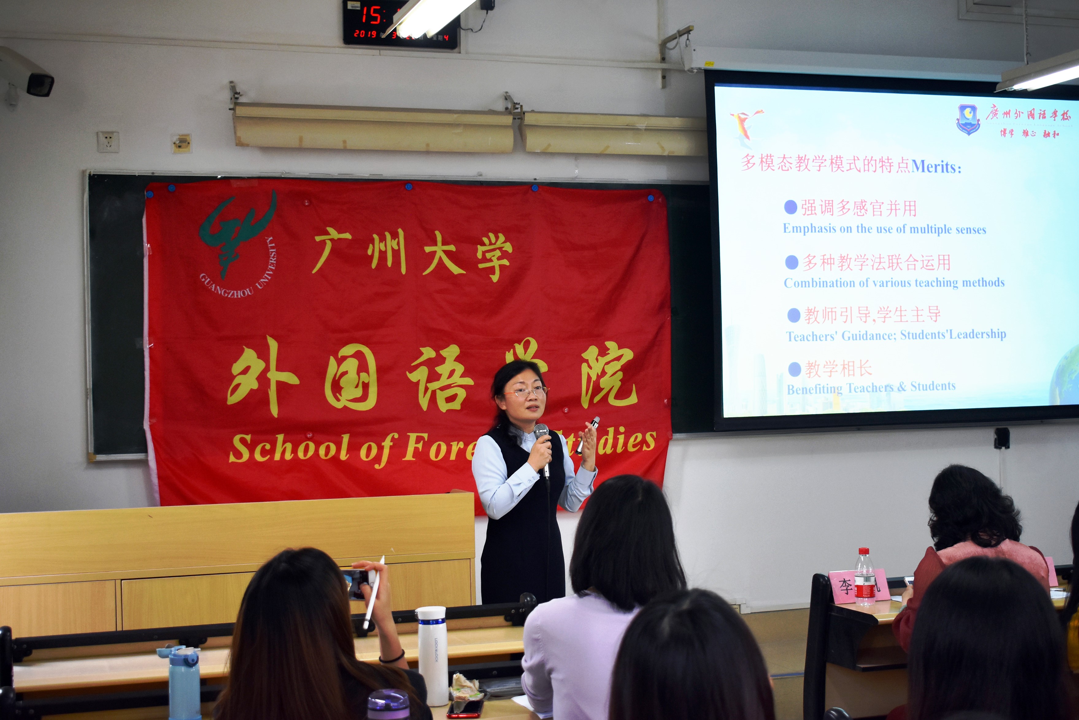 “基础教育名家大讲坛”暨“基础教育名师面对面”第四场活动在文新524课室举行。该活动也是广州市基础教育系统新一轮“百千万人才培养工程”第三批中学名教师培养对象的示范带学活动,由学院副院长苏远连教授主持,英语系陈丽虹副主任、杨冬玲副教授与16级本科生、18级研究生出席了活动。