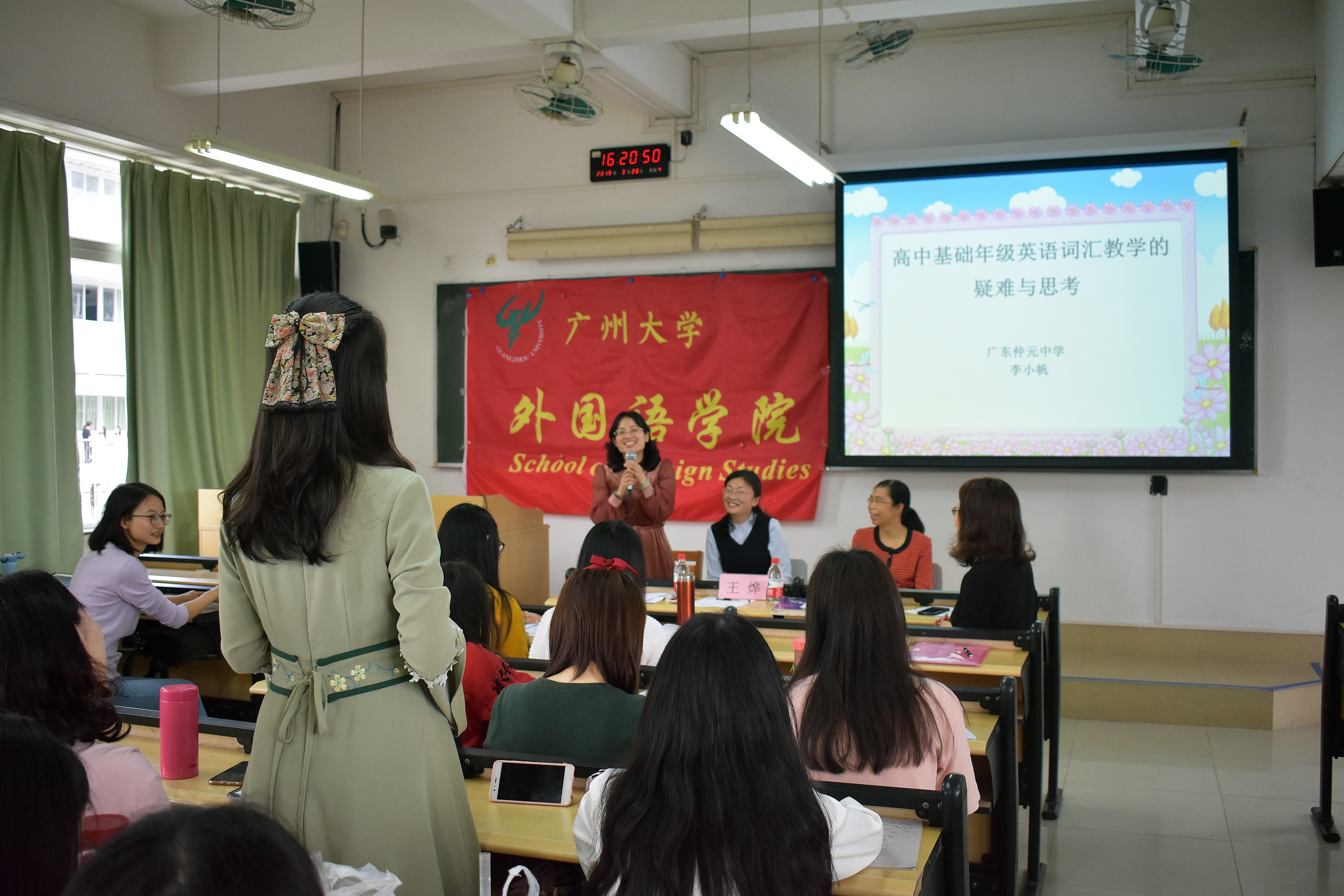 讲座后,进入“名师面对面活动”环节。两位名师培养对象的指导教师——广州市执信中学英语科科组长林佩华老师与李小帆、王烨老师一起与在座师生进行了面对面的交流互动。现场气氛活跃,同学们积极踊跃地举手提问,三位经验丰富的一线教师认真倾听,对同学们在英语词汇、语法、听说、分层教学以及作业布置等方方面面的困惑一一给予了细致的解答,给同学们提供了有针对性的教学实践指导建议。