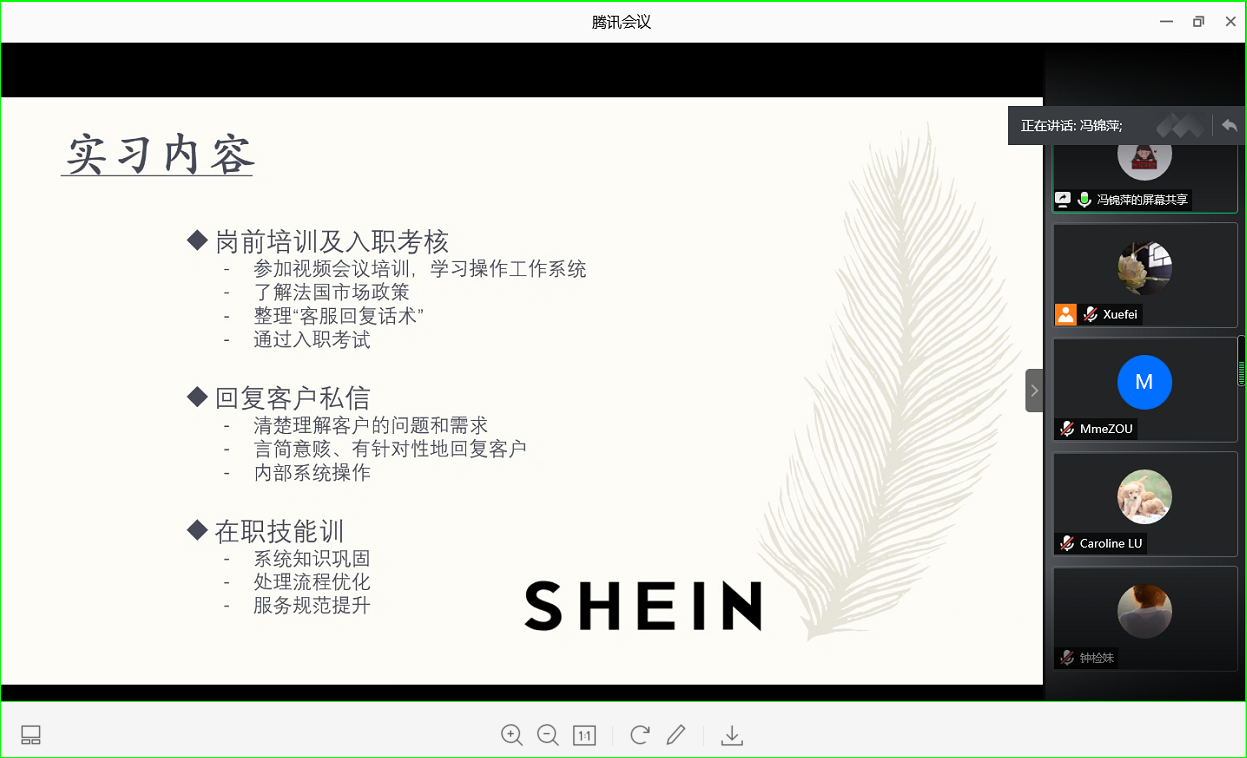 2020年7月28日20:00,法语专业借助腾讯会议平台组织了171班线上分散实习答辩会,系主任邹琰副教授、系副主任陈潇老师,专职教师冯雪飞老师、李悦老师和卢秋燕老师担任答辩评委。9位同学就实习目的、企业介绍、实习内容、实习评价、实习收获等方面进行了汇报,并就评委老师提出的问题给出了满意的回答。